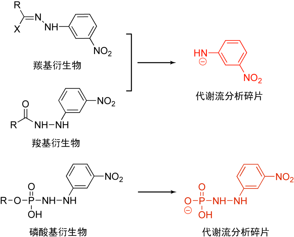 在本研究中,作者采用3-硝基苯肼(3-nitrophenylhydrazine, 3-NPH)作為衍生化試劑,對羰基代謝物、羧基代謝物和磷酸基代謝物進(jìn)行同步衍生化,從而使用一種衍生試劑同時衍生化多種類代謝物,極大地提高了單次分析中代謝物的覆蓋度。