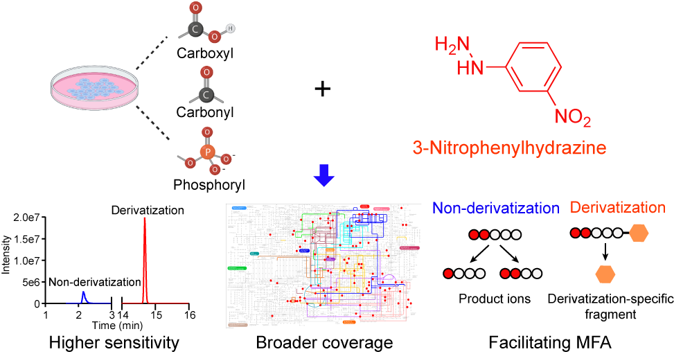 圖1. 3-硝基苯肼衍生化策略提高代謝組檢測靈敏度、拓寬覆蓋度、簡化代謝流分析