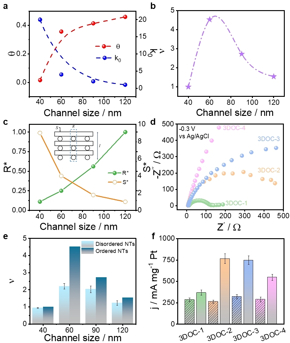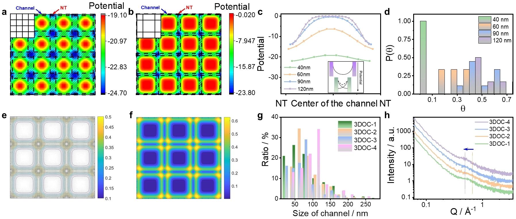 研究人員選取鉑納米管(Pt NTs)為模型催化劑,利用氣液界面組裝和原位電化學(xué)刻蝕活化策略構(gòu)筑了理想的最大程度暴露活性面的三維有序通道結(jié)構(gòu)(3DOC),并選取甲醇氧化反應(yīng)(MOR)作為模型反應(yīng)對其電催化性能進(jìn)行了測試。通過調(diào)節(jié)三維通道的尺寸大小,研究人員發(fā)現(xiàn)存在最佳的尺寸使得甲醇氧化性能最高,比傳統(tǒng)滴涂形成的雜亂分布的催化劑性能提升近2倍。研究人員從電極表面的自由能密度函數(shù)出發(fā),建立了一個全動力學(xué)模型,對不同孔徑通道內(nèi)甲醇分子的電勢分布、傳輸速率、濃度分布以及三維通道的上下電子輸運(yùn)進(jìn)行了模擬。結(jié)果表明,三維通道尺寸增大將極大地避免催化劑表面雙電層的交疊,從而促進(jìn)甲醇分子從體相電解質(zhì)到催化劑表面雙電層的傳質(zhì)過程(圖2)。
