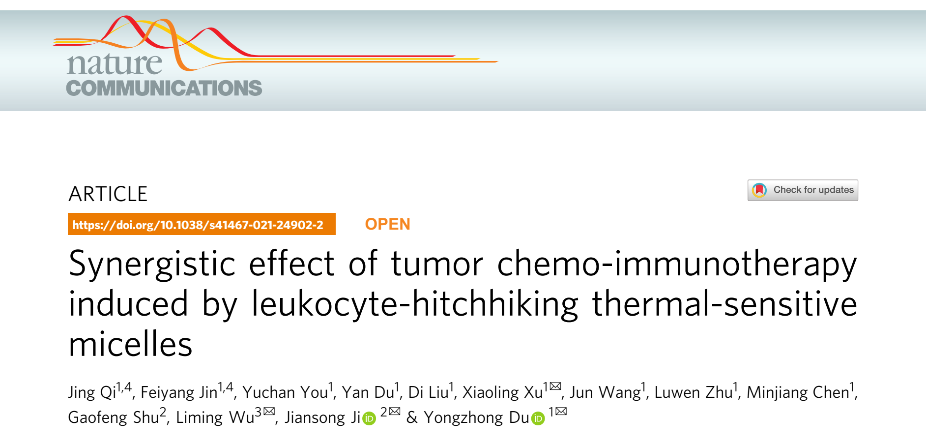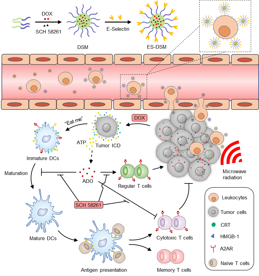 杜永忠教授致力于新型納米給藥系統(tǒng)的開發(fā)及腫瘤靶向免疫治療研究,課題組近年來在Angewandte Chemie International Edition、Nano Letters、Biomaterials、 Journal of Controlled Release、ACS Applied Materials & Interface等國際著名期刊發(fā)表多項(xiàng)原創(chuàng)性工作。本研究在前期工作的基礎(chǔ)上,針對上述矛盾,設(shè)計(jì)了一種共載ICD誘導(dǎo)劑阿霉素和A2AR拮抗劑SCH 58261的溫敏性膠束,并在表面修飾E-選擇素,靜脈注射后可在E-選擇素的介導(dǎo)下粘附在白細(xì)胞的表面,隨白細(xì)胞一同遷移至腫瘤部位,實(shí)現(xiàn)納米粒的腫瘤高度富集,還解決了人工合成納米粒易被網(wǎng)狀內(nèi)皮系統(tǒng)捕獲、難以穿透生物屏障等問題。