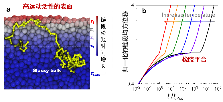 圖2 a 表面分子運(yùn)動(dòng)能力深度分布和高分子鏈構(gòu)象示意圖;τ代表鏈段松弛時(shí)間(τ1 < τ3 < τ5 < τ7 < τbulk);