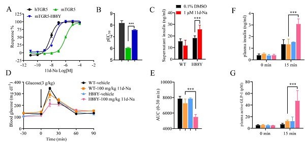 考慮到三萜類化合物固有的理化性質(zhì)缺陷,研究人員采取成鹽的方式得到溶解度和滲透性大幅提升的化合物11d-Na(hTGR5 EC50 = 6.81 ± 1.8 nM)。在TGR5H88Y人源化小鼠模型上進(jìn)行的藥效學(xué)實(shí)驗(yàn)中,11d-Na表現(xiàn)出良好的改善糖耐量的活性,也顯著提升了給予葡萄糖后突變鼠體內(nèi)的胰島素和GLP-1的分泌水平(在野生型小鼠模型中難以觀察到11d-Na的降糖活性)。