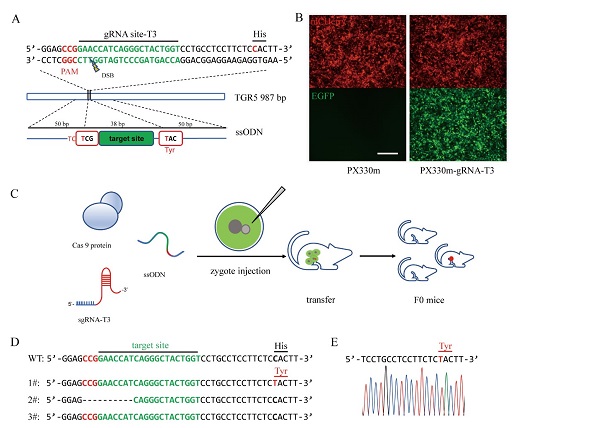 圖1 通過(guò)CRISPR-Cas9構(gòu)建TGR5H88Y人源化小鼠