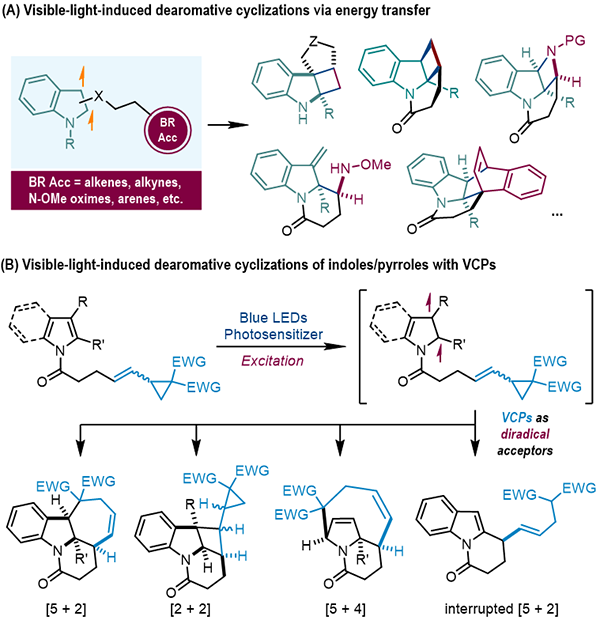 可見(jiàn)光是一種清潔環(huán)保的可再生資源??梢?jiàn)光催化反應(yīng)因其迥異于熱化學(xué)轉(zhuǎn)化的反應(yīng)行為,近年來(lái)在有機(jī)合成中得到了廣泛的應(yīng)用。值得注意的是,將可見(jiàn)光誘導(dǎo)的能量轉(zhuǎn)移過(guò)程與去芳構(gòu)化反應(yīng)相結(jié)合,可在溫和的反應(yīng)條件下高效地構(gòu)建復(fù)雜三維分子骨架。中科院上海有機(jī)所金屬有機(jī)化學(xué)國(guó)家重點(diǎn)實(shí)驗(yàn)室游書(shū)力研究員團(tuán)隊(duì)一直致力于發(fā)展可見(jiàn)光介導(dǎo)的去芳構(gòu)化反應(yīng)。在前期工作中該團(tuán)隊(duì)發(fā)現(xiàn),在可見(jiàn)光的照射和光敏劑存在條件下吲哚衍生物可通過(guò)能量轉(zhuǎn)移機(jī)制激發(fā)至三重態(tài),并與分子內(nèi)烯烴、炔烴發(fā)生[2+2]環(huán)加成反應(yīng),構(gòu)建含環(huán)丁烷或環(huán)丁烯單元的吲哚啉衍生物(J. Am. Chem. Soc. 2019, 141, 2636, CCS Chem. 2020, 2, 652);與N-甲氧基肟醚發(fā)生[2+2]環(huán)加成反應(yīng)或1,5-氫原子轉(zhuǎn)移反應(yīng),構(gòu)建吲哚啉并氮雜環(huán)丁烷和indolizidine類衍生物(ACS Catal. 2020, 10, 12618);與另一芳香環(huán)發(fā)生雙去芳構(gòu)化[4+2]或[2+2]環(huán)加成反應(yīng),實(shí)現(xiàn)了一系列結(jié)構(gòu)新穎的三維分子結(jié)構(gòu)的構(gòu)建(Angew. Chem. Int. Ed. 2021, 60, 7036)(圖1A)。