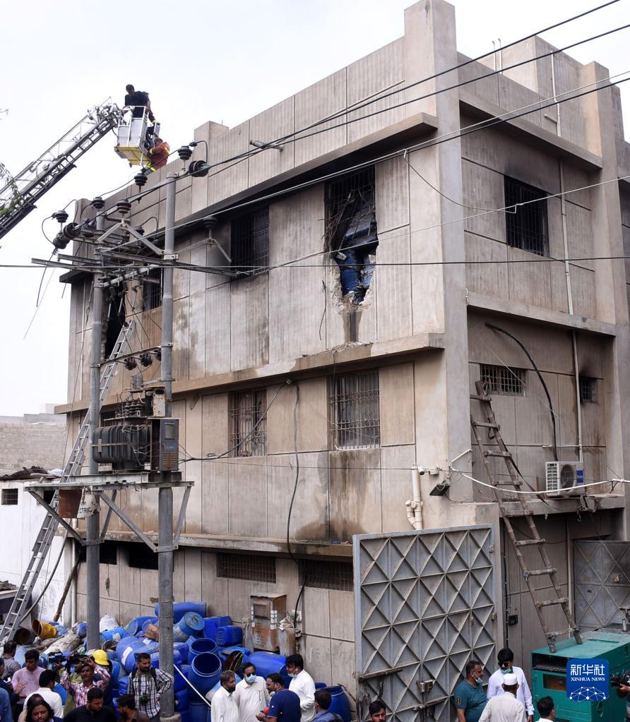8月27日,救援人員在巴基斯坦卡拉奇的火災現(xiàn)場工作。新華社發(fā)