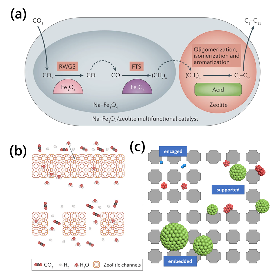 圖:(a)分子篩基雙功能催化劑催化CO2加氫制備C5+產(chǎn)物;(b)分子篩薄膜用于高溫高壓氣體中篩分水;(c)分子篩作為載體能有效限域并穩(wěn)定客體分子。