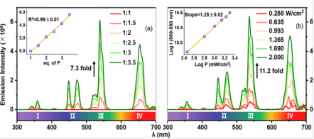 研究者巧妙地利用三齒H2hmq配體的多重配位模式組裝能級匹配的稀土敏化劑(S)和激活劑(A)砌塊,拉近二者的距離(< 3.7 ?)并調(diào)節(jié)二者比例(2:1),飽和LnIII的配位數(shù),合成了一系列稀土配合物(1-6)。進(jìn)而利用氟離子降低非輻射躍遷并調(diào)控激發(fā)光子在上轉(zhuǎn)換(UC)與下轉(zhuǎn)換(DL)過程的競爭,借助多種混合機(jī)制的協(xié)同作用,化合物1首次在室溫有機(jī)溶劑中最低激發(fā)功率密度P = 0.288 W/cm2激發(fā)下觀察到UCL信號,并且在P= 2 W/cm2時,其在甲苯中的ФUC達(dá)到了最高,至少是先例的20倍。