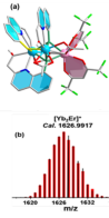 圖: 1的晶體結(jié)構(gòu)圖及對應(yīng)質(zhì)譜圖;引入3.5當(dāng)量的[Bu4N]F的1 在CH2Cl2 (2 × 10-4 M)中的UCL (lex = 980 nm)依賴于[Bu4N]F的量 (2 W/cm2) (a)和P的強(qiáng)度變化圖(b)。