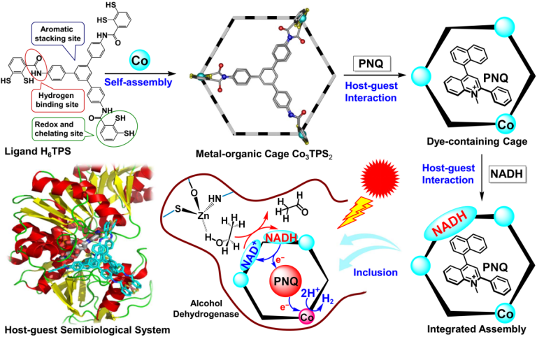 圖1. 金屬-有機籠狀結(jié)構(gòu)的構(gòu)筑及其與天然酶結(jié)合形成的“套娃”式集成組裝體在光催化乙醇分解中的應用
