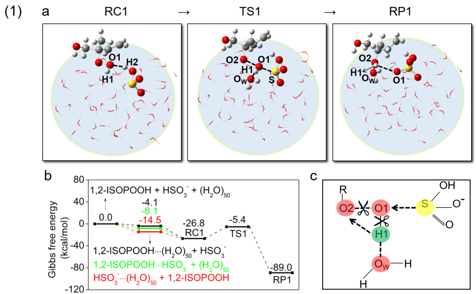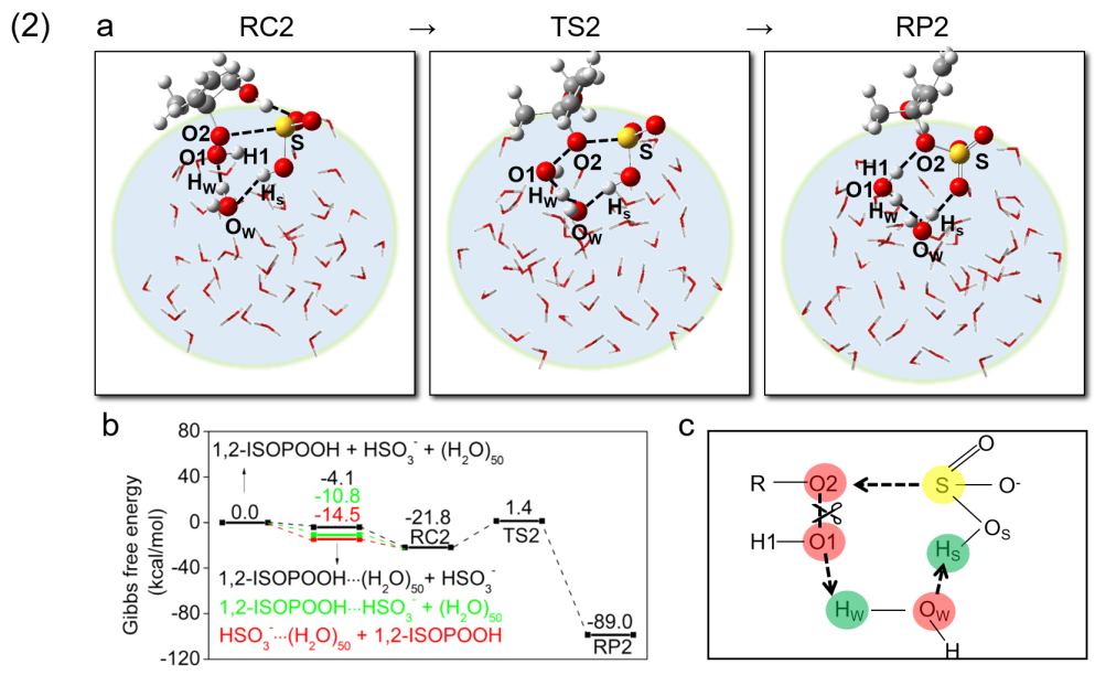 圖2. 異戊二烯過氧化物與HSO3-的反應(yīng)機理:(1) 產(chǎn)物為硫酸鹽:a 反應(yīng)物(RC1)、過渡態(tài)(TS1)、反應(yīng)產(chǎn)物(RP1);b 反應(yīng)勢能面;c 關(guān)鍵反應(yīng)位點示意圖; (2) 產(chǎn)物為有機硫酸酯:a 反應(yīng)物(RC2)、過渡態(tài)(TS2)、反應(yīng)產(chǎn)物(RP2);b 反應(yīng)勢能面;c 關(guān)鍵反應(yīng)位點示意圖。