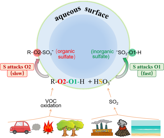 鑒于此,科學家對二氧化硫和有機過氧化物的液相反應(yīng)開展了系列實驗模擬研究,發(fā)現(xiàn)反應(yīng)主要產(chǎn)物為硫酸鹽和有機硫酸酯。然而,由于實驗條件的限制,除硫酸鹽和有機硫酸酯的相對含量高低存在爭議外,反應(yīng)的場所(在溶液內(nèi)部還是在非均相界面上)和微觀反應(yīng)機理未知,限制了對大氣二次顆粒物形成的準確預測。