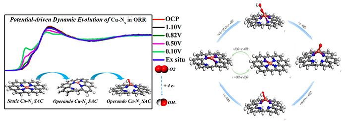 近日,中國科學(xué)院大連化學(xué)物理研究所催化與新材料研究室(十五室)張濤院士、王愛琴研究員、楊小峰研究員等與廈門大學(xué)田中群院士、李劍鋒教授等合作,在氮碳載體上設(shè)計(jì)并構(gòu)筑了均勻分散的銅單原子催化劑(Cu-N-C SAC),將其應(yīng)用于堿性電催化氧還原反應(yīng)中,并通過原位X射線吸收光譜技術(shù)(operando-XAS)揭示其在反應(yīng)過程中的可逆動(dòng)態(tài)演變。