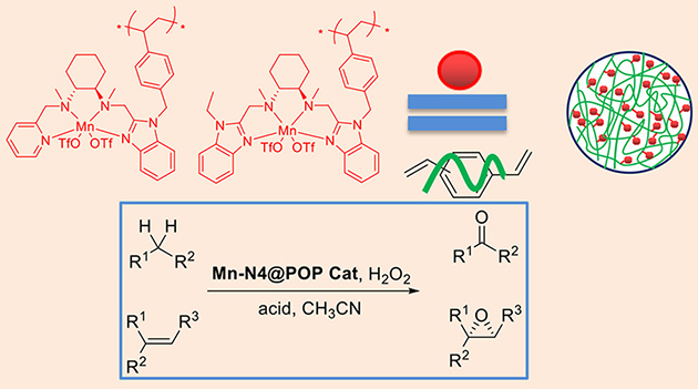 中國(guó)科學(xué)院蘭州化學(xué)物理研究所羰基合成與選擇氧化國(guó)家重點(diǎn)實(shí)驗(yàn)室孫偉課題組多年來(lái)致力于非血紅素酶仿生催化氧化研究。最近,他們?cè)谇捌诎l(fā)展的手性四氮金屬配合物催化氧化工作的基礎(chǔ)上(Acc. Chem. Res. 2019, 52, 2370-2381.), 同時(shí)考慮到生物酶催化的特點(diǎn),將單一的錳配合物通過(guò)聚合反應(yīng),錨定在多孔聚合物孔道內(nèi),形成單位點(diǎn)的錳催化劑,實(shí)現(xiàn)了烷烴的C-H氧化和烯烴的不對(duì)稱(chēng)環(huán)氧化反應(yīng)。