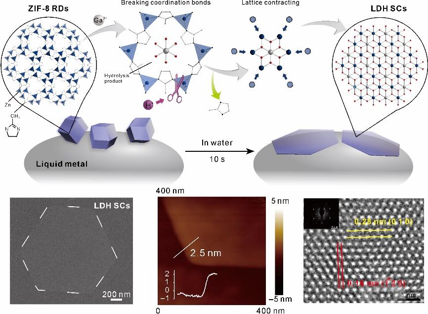 課題組利用液態(tài)金屬鎵(Ga)和母體晶體之間的相互作用,實現(xiàn)了從三維金屬有機框架化合物到二維層狀雙金屬氫氧化物之間速度超快、結構大幅變化的單晶—單晶轉變,整個過程僅需10秒。轉變后的子體單晶繼承了母體單晶的有序的金屬原子排列,這意味著可以通過調控母體單晶中金屬組成來設計合成含有多種金屬元素的氫氧化物。此外通過單晶—單晶轉變制備得到的二維層狀雙金屬氫氧化物同時具有超薄和高結晶性的優(yōu)勢,使其光催化二氧化碳還原的活性得到明顯提升。這種獨特的單晶轉變引發(fā)了對晶體轉變機制的思考,極大地拓展了單晶—單晶轉變領域的研究范圍,同時也為制備高結晶性的二維材料提供了新思路。