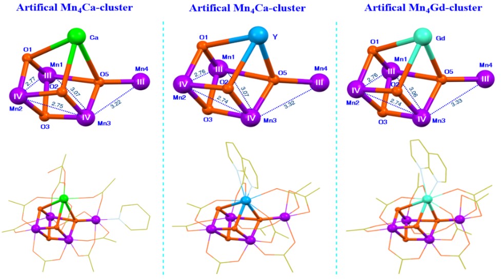 圖1.三種仿生Mn4XO4-簇合物(X = Ca2+/Y3+/Gd3+)的核心和整體結(jié)構(gòu)比較
