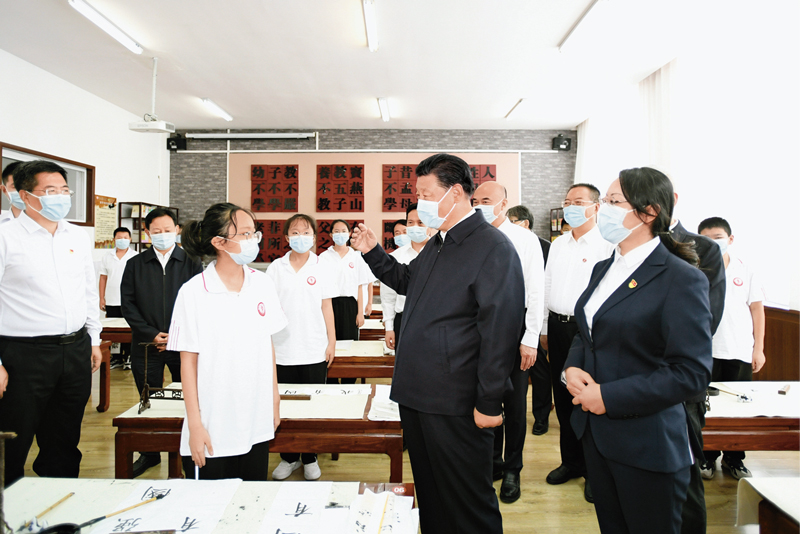 2021年9月13日至14日,中共中央總書記、國(guó)家主席、中央軍委主席習(xí)近平在陜西省榆林市考察。這是14日上午,習(xí)近平在綏德實(shí)驗(yàn)中學(xué)考察時(shí),同正在練習(xí)書法的學(xué)生親切交流。 新華社記者 李學(xué)仁/攝