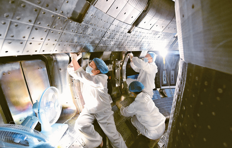 2021年5月28日,中國(guó)科學(xué)院合肥物質(zhì)科學(xué)研究院有“人造太陽(yáng)”之稱的全超導(dǎo)托卡馬克核聚變實(shí)驗(yàn)裝置(EAST)創(chuàng)造新的世界紀(jì)錄,成功實(shí)現(xiàn)可重復(fù)的1.2億攝氏度101秒和1.6億攝氏度20秒等離子體運(yùn)行,向核聚變能源應(yīng)用邁出重要一步。圖為工作人員對(duì)全超導(dǎo)托卡馬克核聚變實(shí)驗(yàn)裝置(EAST)進(jìn)行升級(jí)改造。 新華社記者 周牧/攝