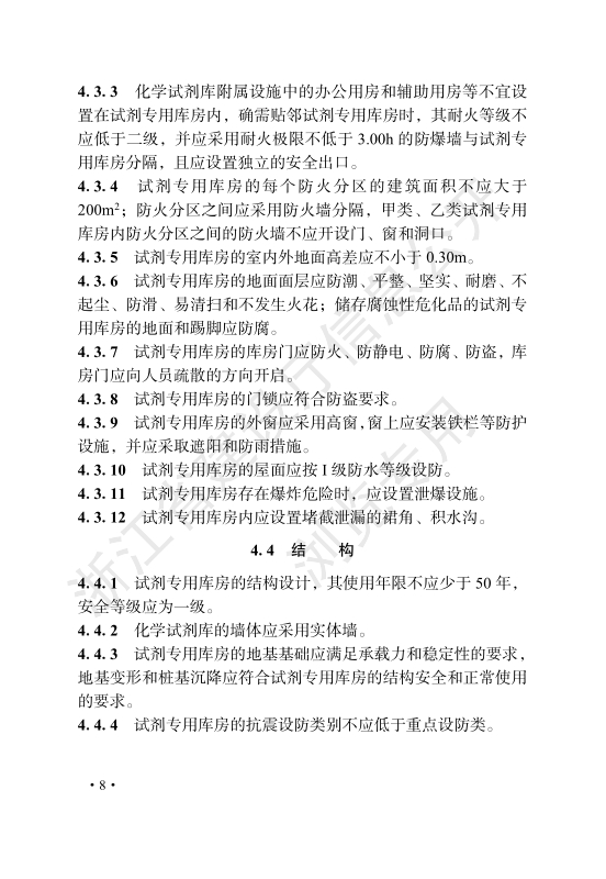 8. 在日常使用或發(fā)生意外和事故的情況下,化學(xué)試劑庫的設(shè)施設(shè)備均不得對人員造成傷害;在發(fā)生意外和事故情況下,化學(xué)試劑庫應(yīng)便于救援和事故處置,不得發(fā)生二次災(zāi)害,并應(yīng)避免或減小財產(chǎn)損失。