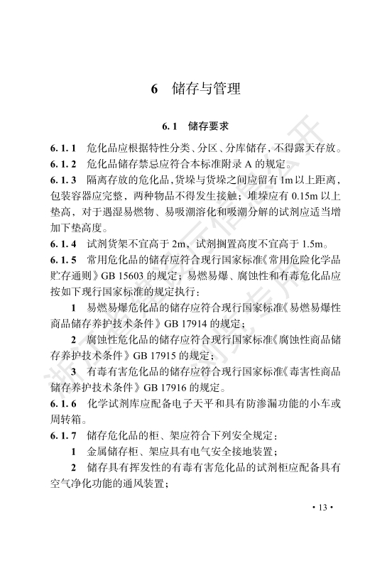 12. ?;返膬Υ媪坎粦?yīng)大于現(xiàn)行國家標(biāo)準(zhǔn)《危險化學(xué)品重大危險源辨識》GB 18218 中?;放R界量的 50%;試劑專用庫房的試劑總儲存量不應(yīng)大于 10t,其中甲類試劑儲存量不應(yīng)大于 3t,且每平方米的試劑儲存量不應(yīng)大于 0.3t。