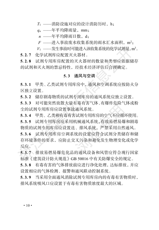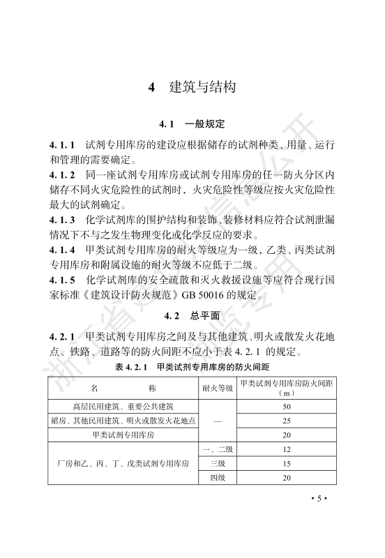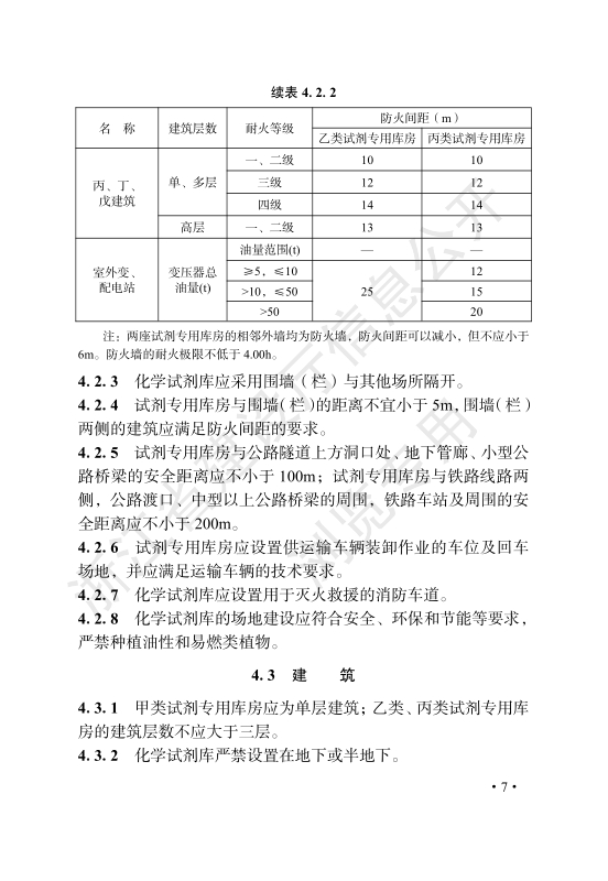 7. 試劑專用庫房應(yīng)根據(jù)儲存物品的火災(zāi)危險性和儲存物品中可燃物數(shù)量等因素,劃分為甲類、乙類和丙類;試劑專用庫房的火災(zāi)危險性分類應(yīng)符合現(xiàn)行國家標(biāo)準(zhǔn)《建筑設(shè)計防火規(guī)范》GB 50016 的相關(guān)規(guī)定。