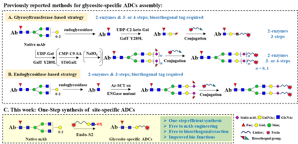 Fc結(jié)構(gòu)域N297位是抗體保守的糖基化位點,在該位點引入細(xì)胞毒素形成的糖鏈定點ADC化合物(glycosite-specific ADCs, gsADCs)具有不影響抗原結(jié)合、穩(wěn)定性更好等優(yōu)勢,近年來受到廣泛關(guān)注。目前,已報導(dǎo)的糖鏈定點偶聯(lián)策略首先需要對抗體進(jìn)行糖工程改造,通過糖基轉(zhuǎn)移酶或糖苷內(nèi)切酶在糖基化位點引入生物正交基團(tuán),進(jìn)一步通過生物正交反應(yīng)偶聯(lián)毒素,從而實現(xiàn)糖鏈定點ADC的制備(如圖1所示)。整個過程往往需要2-3種酶的參與,3-4步的反應(yīng),底物合成復(fù)雜且依賴于生物正交反應(yīng),阻礙了糖鏈定點ADC藥物系統(tǒng)性的構(gòu)效關(guān)系研究。