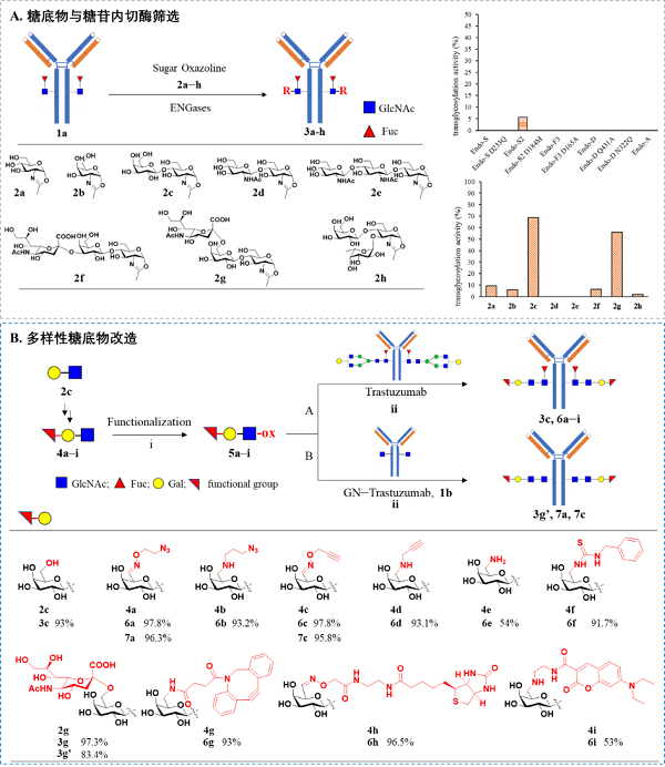 圖2. 糖底物及糖苷內(nèi)切酶的篩選及抗體的多樣性糖工程改造。A,糖底物及糖苷內(nèi)切酶的篩選;B,LacNAc的衍生化及抗體的糖工程改造。