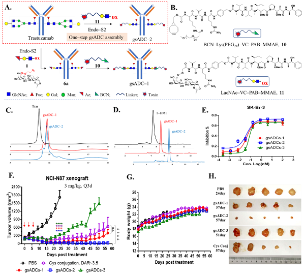 圖3. 基于LacNAc和Endo-S2的糖鏈定點ADC化合物制備。A-B,糖鏈定點ADC化合物的“一步”和“兩步”制備策略;C,疏水相互作用色譜(HIC)顯示出該策略制備的定點ADC化合物均有很好的結(jié)構(gòu)均一性;D,分子排阻色潽(SEC)顯示出該策略制備的定點ADC化合物具有很好的穩(wěn)定性;E,定點ADC化合物對SK-Br-3細(xì)胞的體外抑制曲線;F,ADC化合物對NCI-N87移植瘤的體內(nèi)腫瘤抑制曲線;G,小鼠體重曲線;H,治療周期結(jié)束后腫瘤照片。