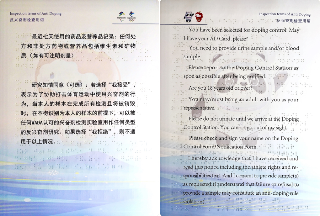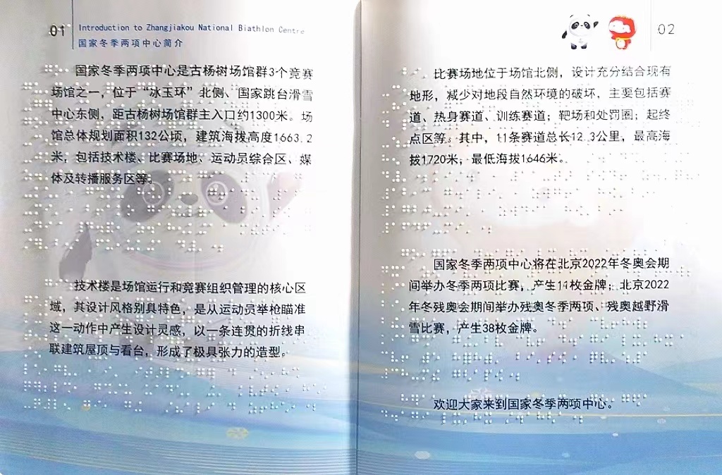 綠色印刷實(shí)驗(yàn)室宋延林團(tuán)隊承擔(dān)了北京冬奧會和冬殘奧會明盲對照的中英文版《北京2022冬奧會和冬殘奧會觀眾手冊》、《北京2022冬殘奧會運(yùn)動員和隨隊官員服務(wù)手冊》、《北京2022冬奧會和冬殘奧會云頂場館群觀賽須知》、《北京2022冬殘奧會-國家冬季兩項(xiàng)中心賽事服務(wù)(EVS)觀眾流線盲文觸感地圖》、《國家冬季兩項(xiàng)中心簡介(明盲雙視版)》等印制任務(wù)。同時,比賽場館也為運(yùn)動員提供了無障礙信息,在反興奮劑檢查站專門配備中英文對照的盲文、大字版反興奮劑檢查用語,方便視障運(yùn)動員清楚地了解相關(guān)事項(xiàng)。中新網(wǎng)北京新聞11月24日相關(guān)報道中特別指出:“印刷技術(shù)采用了中國自主研發(fā)的綠色印刷盲文印制技術(shù),使盲文點(diǎn)字的觸感更好,使用壽命更長?!?/span>