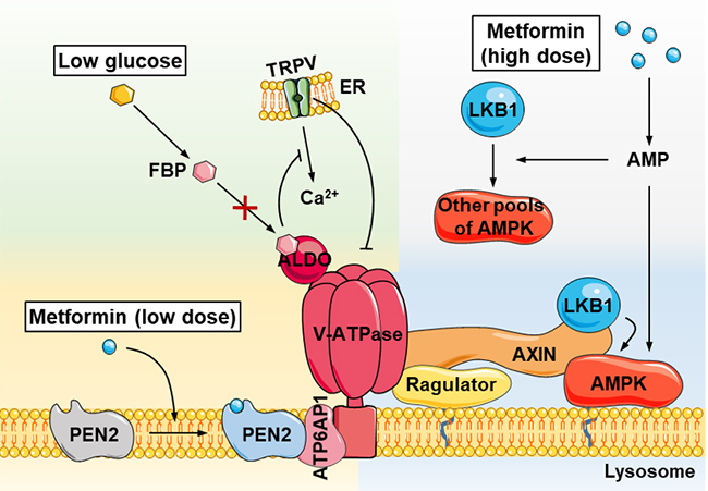 近日,中國(guó)科學(xué)院大連化學(xué)物理研究所中國(guó)科學(xué)院分離分析化學(xué)重點(diǎn)實(shí)驗(yàn)室生物分子功能與機(jī)制研究組(1821組)樸海龍研究員團(tuán)隊(duì)與廈門(mén)大學(xué)林圣彩院士團(tuán)隊(duì)和鄧賢明教授團(tuán)隊(duì)合作,鑒定到二甲雙胍直接作用的分子靶點(diǎn)為PEN2(γ-secretase的亞基),并進(jìn)一步揭示了這一分子間的相互作用介導(dǎo)的溶酶體途徑,激活A(yù)MPK的具體方式,闡釋了AMPK相關(guān)途徑在二甲雙胍所介導(dǎo)的降糖、延長(zhǎng)壽命和延緩衰老等功能上發(fā)揮的重要作用。