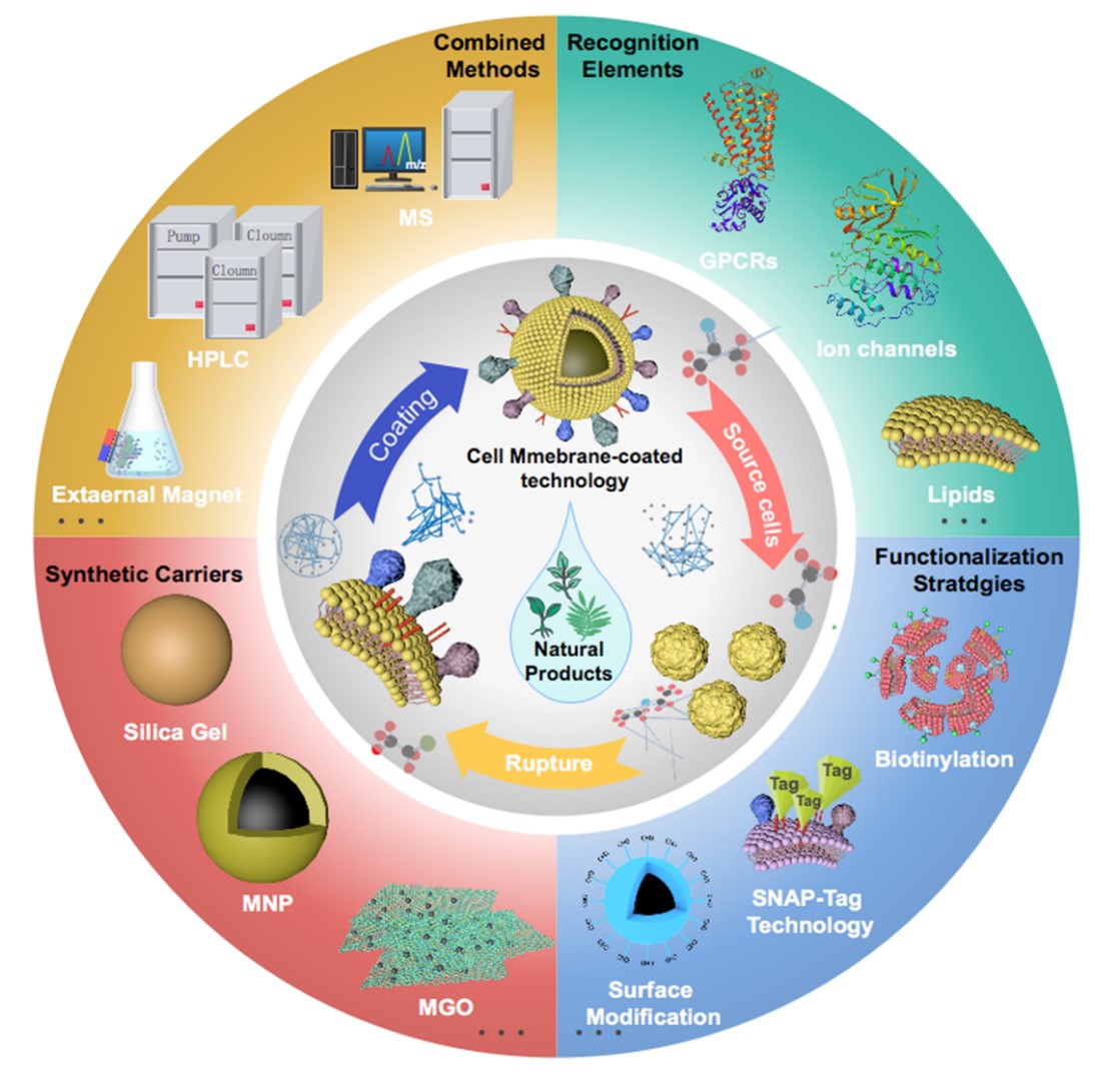 卜羽思助理教授在王嗣岑教授和解笑瑜副教授指導(dǎo)下,以團(tuán)隊(duì)之前的工作為基礎(chǔ)總結(jié)了一系列用于從中藥等天然產(chǎn)物中篩選藥物的天然細(xì)胞膜涂層的仿生材料?;谔烊患?xì)胞膜涂層的仿生技術(shù)用于中藥活性成分篩選研究具有效率高、靈敏度高以及特異性強(qiáng)等優(yōu)勢(shì),并且能夠在一定程度上輔助闡明藥物的作用機(jī)制。這項(xiàng)技術(shù)所制備的細(xì)胞膜包覆材料既可以整合無(wú)機(jī)材料的物理化學(xué)性質(zhì),又能繼承源細(xì)胞表面復(fù)雜的生物功能。綜述系統(tǒng)地描述了該技術(shù)使用細(xì)胞膜涂層進(jìn)行藥物特異性篩選的理論基礎(chǔ),總結(jié)了包括細(xì)胞膜色譜在內(nèi)的4種不同策略,評(píng)價(jià)了不同策略用于藥物發(fā)現(xiàn)的優(yōu)缺點(diǎn),并對(duì)該項(xiàng)技術(shù)未來(lái)的挑戰(zhàn)和發(fā)展進(jìn)行了總結(jié)和討論。