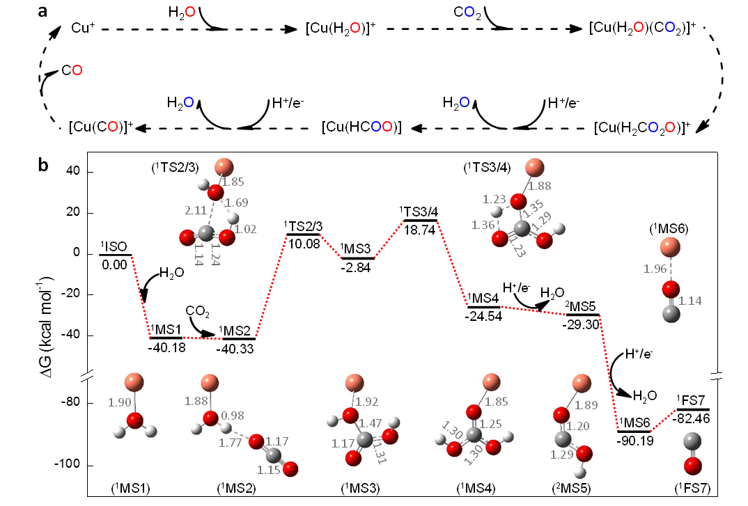 按照傳統(tǒng)觀點,二氧化碳還原轉(zhuǎn)化為一氧化碳中的O原子來自二氧化碳。該研究中,科研人員發(fā)現(xiàn)還原反應(yīng)生成一氧化碳中的O原子來自反應(yīng)體系催化劑表面的配位水分子,而非二氧化碳本身。該結(jié)論不僅適用于質(zhì)在線反應(yīng)過程,也適用于實際二氧化碳的電催化還原反應(yīng)和工業(yè)化水煤氣逆反應(yīng)過程,說明該發(fā)現(xiàn)具有一定的普適性。同時發(fā)現(xiàn)相比于金屬催化劑Cu+,當(dāng)[Cu(H2O)]+作為催化劑時,二氧化碳還原為一氧化碳的反應(yīng)效率可提高兩個數(shù)量級。為了深入探究該反應(yīng)過程,科研人員通過改造質(zhì)譜儀對反應(yīng)中間體的捕獲、同位素對比實驗和密度泛函理論的計算,詳細(xì)闡述了二氧化碳在[Cu(H2O)]+催化作用下生成一氧化碳的機制。該工作不僅為深入闡述二氧化碳還原機理提供了方法學(xué)基礎(chǔ),也為詳細(xì)了解水在二氧化碳還原過程中的作用提供了著眼點。