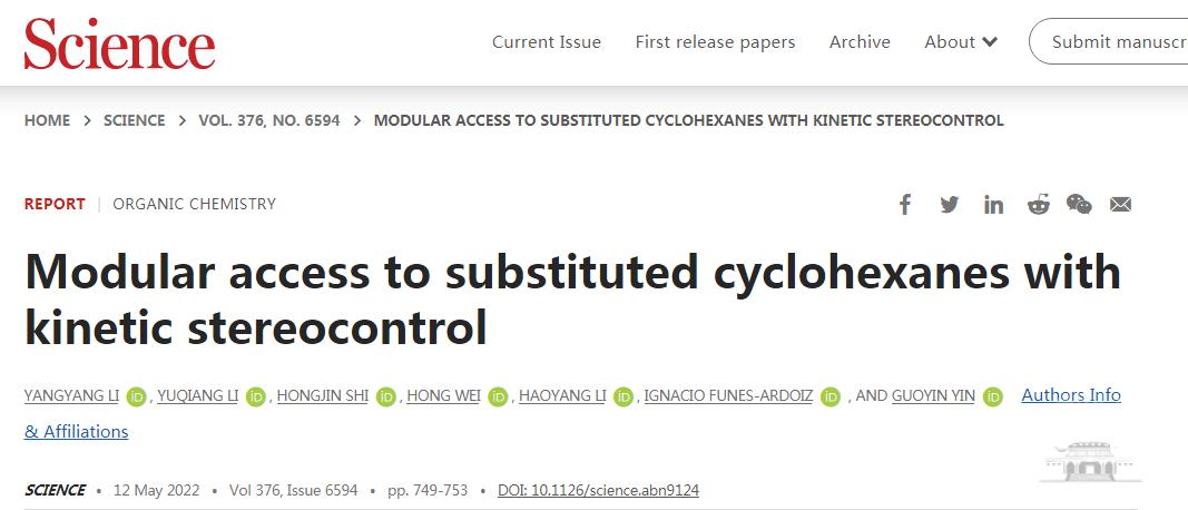 論文題為“Modular access to substituted cyclohexanes with kinetic stereocontrol”(《動力學控制的取代環(huán)己烷的模式化合成》),武漢大學高等研究院為該論文第一署名單位,陰國印為第一通訊作者,高等研究院2018級博士研究生李陽陽為第一作者,西班牙拉里奧哈大學的博士后Ignacio Funes-Ardoiz為該研究機理解釋提供了理論計算支持、為該論文的共同通訊作者,課題組博士研究生李玉強、史宏進和碩士研究生魏紅、李浩陽為該項研究實驗部分做出了重要貢獻。