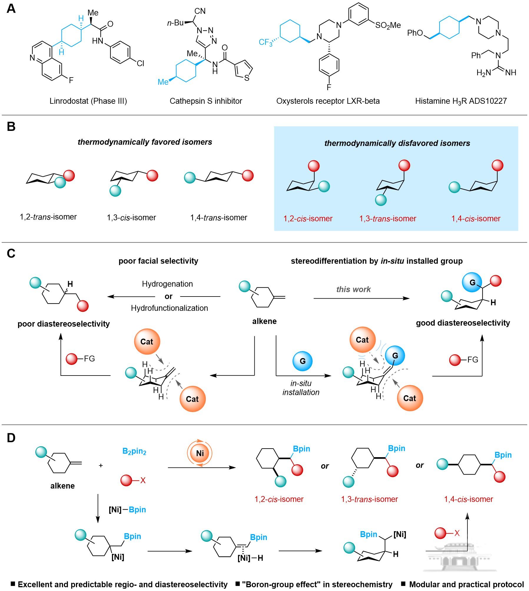 與平面的生物同位體相比,具有三維復(fù)雜的幾何形狀的藥物分子,通常具備更好的生物活性和物理特征。因此,創(chuàng)建高效的合成方法,以立體定向的方式構(gòu)建飽和環(huán)狀化合物一直是合成化學領(lǐng)域的研究熱點。環(huán)己烷的一個取代基在平伏鍵,另一個在直立鍵,即1,2-cis,1,3-trans,1,4-cis取代模式,廣泛存在于藥物分子中。此外,它們往往表現(xiàn)出比其熱力學上有利的同分異構(gòu)體更好的生物活性。自從1928年Diels和Alder報道環(huán)戊二烯與順丁烯二酸酐的環(huán)加成反應(yīng)后,人們一直沒有停止對環(huán)己烷合成的探索,然而到目前為止,仍未有一種高效的、模式化合成動力學控制的取代環(huán)己烷(即1,2-順式,1,3-反式以及1,4-順式構(gòu)型的環(huán)己烷)的方法。