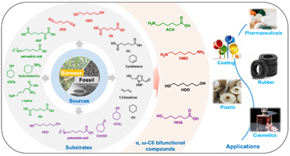 圖 1. 石油/生物原料合成四種 α, ω-C6 雙功能化合物的示意圖及其應(yīng)用。