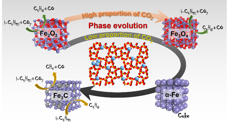 Fe基催化劑具有價(jià)格低廉、環(huán)境友好等優(yōu)勢(shì),被應(yīng)用于催化乙烷、丙烷、異丁烷等烷烴脫氫反應(yīng)中。在此過程中,將二氧化碳作為弱氧化劑引入,可以促進(jìn)烷烴轉(zhuǎn)化、減少積炭、抑制深度氧化,是目前的研究熱點(diǎn)之一。CO2引入對(duì)Fe基催化劑的活性相演變規(guī)律的研究將極大促進(jìn)鐵基催化劑性能的優(yōu)化。