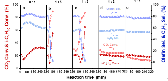 不同CO2/i-C4H10進(jìn)料比下異丁烷脫氫反應(yīng)性能