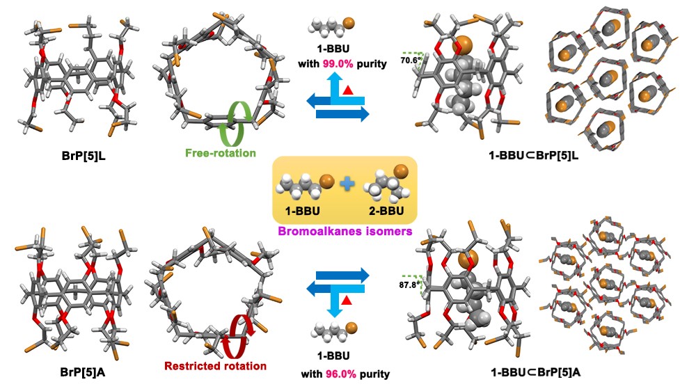 在前期的工作中,該課題組設(shè)計(jì)合成了一例“骨架精簡版的”甲基柱[5]芳烴衍生物,即精巧型甲基柱[5]芳烴(permethylated leggero pillar[5]arene),并進(jìn)一步在固相條件下實(shí)現(xiàn)了對(duì)其分子堆積從無序到有序(無定形態(tài)至晶態(tài))的精準(zhǔn)調(diào)控(J. Am. Chem. Soc.2021,143, 20395)。在此研究工作基礎(chǔ)之上,該課題組成功設(shè)計(jì)并合成了一種全溴乙基取代的精巧型柱[5]芳烴衍生物(perbromoethylated leggero pillar[5]arene,簡稱為BrP[5]L),隨后通過客體誘導(dǎo)的方式實(shí)現(xiàn)了對(duì)其固相分子堆積從無序到有序的精準(zhǔn)調(diào)控并同時(shí)利用該過程實(shí)現(xiàn)了對(duì)鹵代烴位置異構(gòu)體的高精準(zhǔn)式吸附與分離應(yīng)用(圖一)。實(shí)驗(yàn)結(jié)果表明,無定形且無孔的BrP[5]L粉末可以通過固相主客體相互作用來吸附多種溴代烷烴蒸汽(1-溴丙烷、2-溴丙烷、1-溴丁烷以及2-溴丁烷),進(jìn)而構(gòu)筑得到多種溴代烷絡(luò)合形式的有序超分子組裝體。同時(shí),作者發(fā)現(xiàn)1-溴代烷和2-溴代烷與BrP[5]L之間所形成的固相主客體絡(luò)合結(jié)構(gòu)具有不同的鍵合模式以及熱力學(xué)穩(wěn)定性差異,這使得無定形BrP[5]L粉末在1-/2-溴代烷烴位置異構(gòu)體的吸附分離方面展現(xiàn)出了巨大的應(yīng)用潛力。