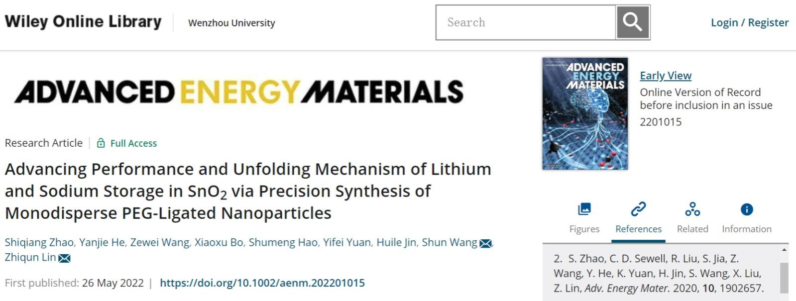 近日,國際能源頂級刊物《Advanced Energy Materials》(影響因子:29.368)在線刊登了我校趙世強副教授第一作者的研究論文“Advancing Performance and Unfolding Mechanism of Lithium and Sodium Storage in SnO2 via Precision Synthesis of Monodisperse PEG-Ligated Nanoparticles”(聚乙二醇接枝單分散二氧化錫納米顆粒的精準合成及儲鋰/鈉性能提升和儲能機理探究),溫州大學王舜副校長與佐治亞理工學院(美國)林志群教授為通訊作者,該研究工作受到國家自然科學基金項目(21905208)的資助。