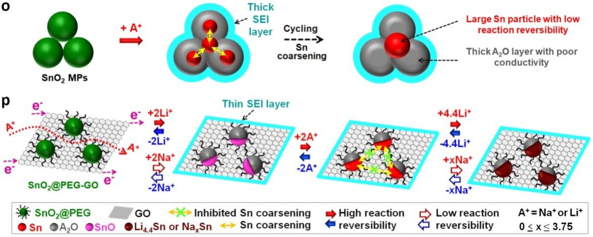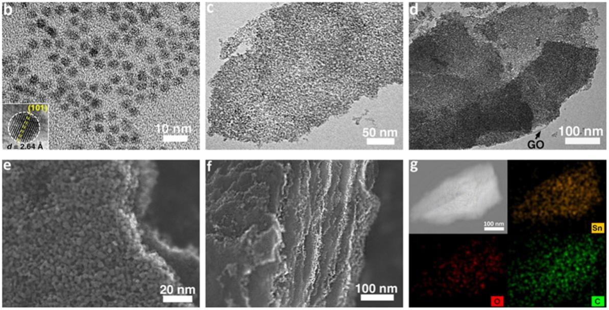 在本文工作中,研究團隊基于前期發(fā)表的論文Advanced Energy Materials,2020,10,2070027(趙世強副教授為第一作者)中提出的抑制Sn粗化的“物理屏障、孔隙邊界、異質(zhì)界面”三種策略,創(chuàng)造性地以聚丙烯酸-嵌段-聚乙二醇(star-like PAA-b-PEG)星型嵌段共聚物為限域納米反應器,實現(xiàn)了4納米均一粒徑SnO2顆粒的精準合成。利用顆粒表面接枝的PEG與氧化石墨烯(GO)上羥基、環(huán)氧基、羧基等功能基團間的氫鍵作用,將SnO2@PEG納米顆粒均勻錨嵌在GO表面,經(jīng)逐層堆疊后獲得SnO2@PEG-GO層狀復合材料。研究證實,納米尺度SnO2具有超高儲鋰儲鈉電化學反應活性,PEG和GO分別作為離子和電子導體顯著提升導電性,且PEG和GO分別作為納米和微米層級的物理屏障高效抑制Sn粗化,使SnO2@PEG-GO展現(xiàn)出超高容量和杰出循環(huán)性能。值得關(guān)注的是,該工作利用高分辨電子顯微鏡、X射線光電子能譜、Raman散射光譜等系列表征手段,詳細闡述了SnO2的三步可逆儲鋰反應過程,并首次證實了SnO2的儲鈉過程主要依賴于SnO和Sn之間的可逆電化學反應。該研究成果將對新型高容量電極材料的設(shè)計合成和儲能機理研究具有一定借鑒意義。