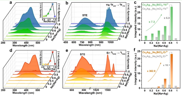 圖1、Cs2Ag1-xNaxBiCl6:Yb3+的(a)激發(fā)光譜和(b)發(fā)射光譜。(c)Cs2Ag1-xNaxBiCl6:Yb3+和Cs2Ag1-xNaxInCl6:Yb3+的近紅外發(fā)光積分強(qiáng)度。Cs2Ag1-xNaxBiCl6:Er3+的(d)激發(fā)光譜和(e)發(fā)射光譜。(f)Cs2Ag1-xNaxBiCl6:Er3+和Cs2Ag1-xNaxInCl6:Er3+的近紅外發(fā)光積分強(qiáng)度。