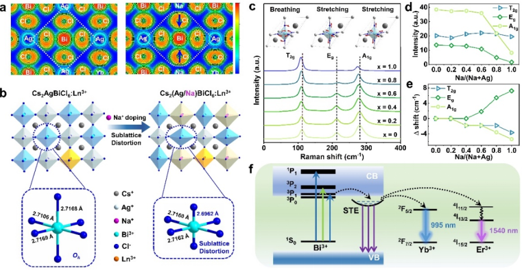 圖2、(a)Cs2AgBiCl6:Yb3+(左)和Cs2Ag0.2Na0.8BiCl6:Yb3+(右)的電荷局域密度圖。(b)Na+摻雜引起Cs2AgBiCl6晶格畸變示意圖。(c)Cs2Ag1-xNaxBiCl6:Yb3+樣品在532 nm激發(fā)下的拉曼光譜,以及各拉曼振動(dòng)模式對(duì)應(yīng)的晶格振動(dòng)示意圖。(d)拉曼振動(dòng)模式的強(qiáng)度以及(e)拉曼峰位移隨Na+含量增加的變化情況。(f)稀土摻雜Cs2Ag0.2Na0.8BiCl6發(fā)光機(jī)理示意圖。