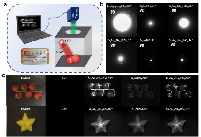 圖3、(a)近紅外拍攝裝置示意圖。(b)近紅外相機(jī)拍攝的不同樣品封裝成NIR-LED后的發(fā)光照片。(c)小番茄(上)和楊桃(下)在日光、暗室和分別被封裝了不同材料的NIR-LED照射下的近紅外相機(jī)拍攝照片。