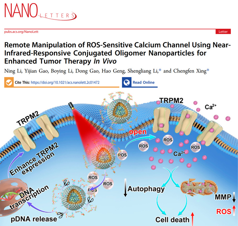 參考文獻:Ning Li, Yijian Gao, Boying Li, Dong Gao, Hao Geng, Shengliang Li*, and Chengfen Xing,* Remote Manipulation of ROS-Sensitive Calcium Channel Using Near-Infrared-Responsive Conjugated Oligomer Nanoparticles for Enhanced Tumor Therapy In Vivo. Nano Lett. 2022, 10.1021/acs.nanolett.2c01472.