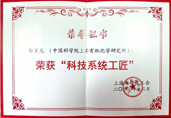 為推動(dòng)落實(shí)《新時(shí)期產(chǎn)業(yè)工人隊(duì)伍建設(shè)改革方案》、《科技系統(tǒng)工匠培養(yǎng)選樹十年計(jì)劃》(滬科工〔2020〕5號(hào)),努力造就一支有理想守信念、懂技術(shù)會(huì)創(chuàng)新、敢擔(dān)當(dāng)講奉獻(xiàn)的職工隊(duì)伍,激發(fā)科技系統(tǒng)職工崗位創(chuàng)新活力,上海市科技工會(huì)決定選樹命名一批科技系統(tǒng)工匠。上海有機(jī)所郭寅龍研究員榮獲2022年度上海市“科技系統(tǒng)工匠”榮譽(yù)稱號(hào)。