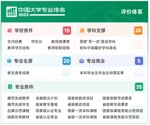 軟科中國大學(xué)專業(yè)排名設(shè)計(jì)了獨(dú)具特色的專業(yè)競爭力評(píng)價(jià)框架,通過學(xué)校——學(xué)科——專業(yè)三個(gè)層次的評(píng)價(jià)匯總形成對(duì)專業(yè)的綜合評(píng)價(jià)。排名指標(biāo)體系設(shè)置學(xué)校條件、學(xué)科支撐、專業(yè)生源、專業(yè)就業(yè)、專業(yè)條件5個(gè)指標(biāo)類別,共25項(xiàng)測量指標(biāo)。