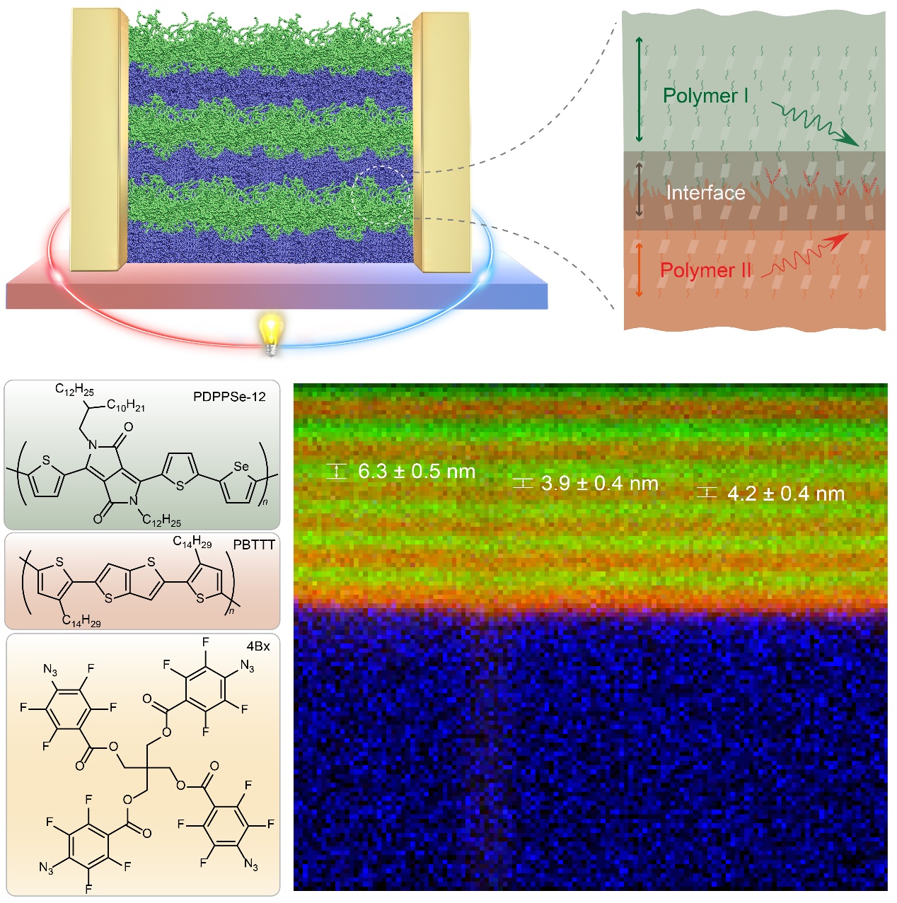 在國家自然科學(xué)基金委、中國科學(xué)院和北京市的支持下,中國科學(xué)院化學(xué)研究所朱道本/狄重安研究團隊與張德清課題組、北京航空航天大學(xué)趙立東課題組及國內(nèi)外其他六個研究團隊合作,提出并構(gòu)建了聚合物多周期異質(zhì)結(jié)(PMHJ)熱電材料。該類型分子組裝體具有周期有序的納米結(jié)構(gòu),其中兩種聚合物厚度均小于10納米,相鄰界面約為2個分子層且具有體相異質(zhì)特征。優(yōu)化后的PMHJ薄膜不但可以保持優(yōu)異的電荷輸運特性,同時大幅抑制聲子/類聲子傳播,從而實現(xiàn)了聚合物熱電性能的大幅躍升,為高性能塑料基熱電材料的研究和應(yīng)用提供了全新路徑。