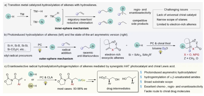 本文通過(guò)使用光催化劑和手性Lewis酸協(xié)同催化策略完成了缺電子烯烴的對(duì)映選擇性硅氫化和鍺氫化反應(yīng)(53 examples)。其中,9,10-蒽醌作為氫原子轉(zhuǎn)移(HAT)光催化劑促進(jìn)Si-H/Ge-H鍵...