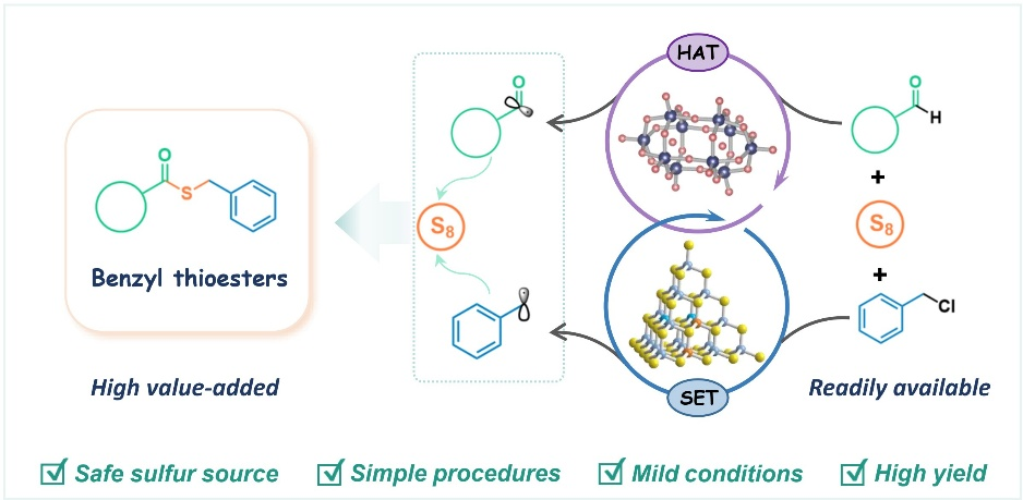 近日,暨南大學(xué)吳濤/袁尚富團(tuán)隊(duì)利用金屬硫族團(tuán)簇催化劑的單電子轉(zhuǎn)移(SET)和多金屬氧酸鹽催化劑的氫原子轉(zhuǎn)移(HAT)協(xié)同催化策略,實(shí)現(xiàn)了從低廉原料(元素硫、芐氯和醛)出發(fā)綠色合成芐基硫代酯。該催化體系...