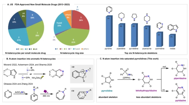南京大學(xué)化學(xué)化工學(xué)院陸紅健教授團隊,通過在溫和條件下使用市售O-二苯基膦羥胺(DPPH)對吡咯烷進行 α-位N-原子插入的新策略,一步將吡咯烷骨架轉(zhuǎn)化為四氫噠嗪骨架,經(jīng)簡單還原或氧化可無縫銜接地得到飽...